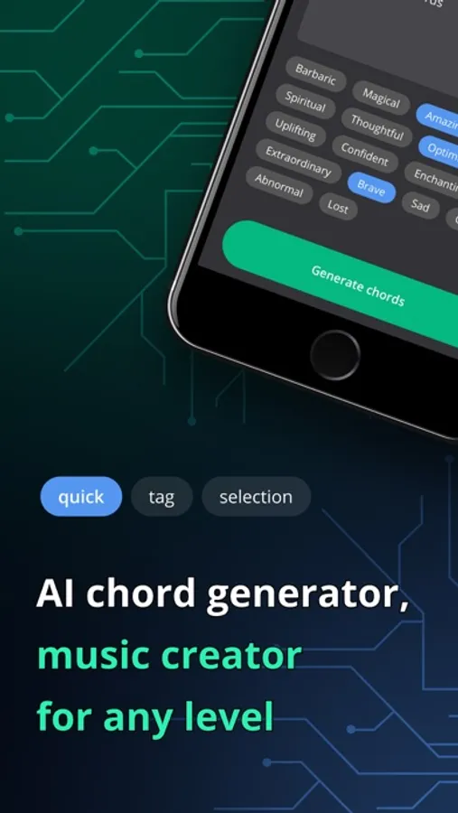 Meet the AI Chord Generator, your personal pocket-sized maestro! You can write whatever comes to mind, and the app will select the appropriate chords for your description, while tags make it easy to navigate and choose chords to suit your mood and theme.