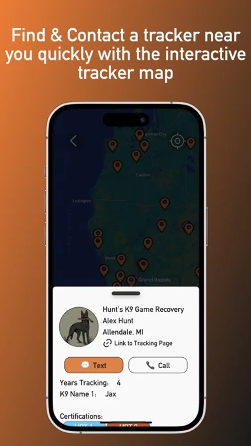 Select a tracker and give them a call or text. Information about the tracking team, their certifications, and their location are all provided in one easy to find location.