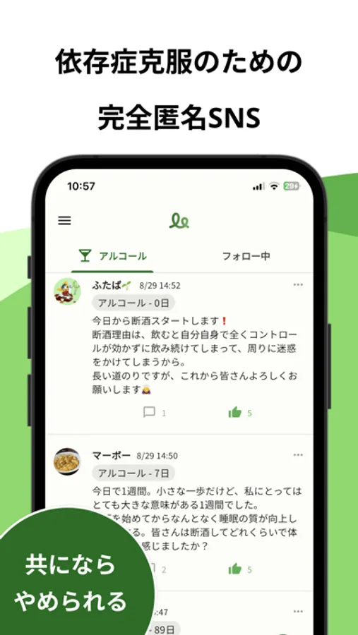 依存症を克服する道のりの中での挑戦や成功を他のユーザーと共有し、繋がりを深められます。