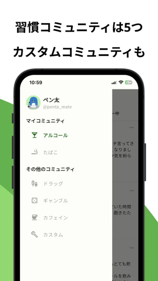 アルコール、たばこ、ドラッグ、ギャンブル、カフェインのコミュニティがあります。この中にやめたい習慣がない場合は自分で習慣名を決め、カスタムコミュニティに参加することができます。