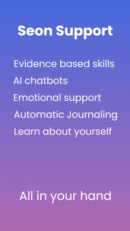 Seon Support harnesses the power of artificial intelligence (AI) to support you through your daily stresses. If you struggle with anxiety, low mood, lack of motivation, relationship problems, loneliness, and other life challenges, our chatbots are here to support you.