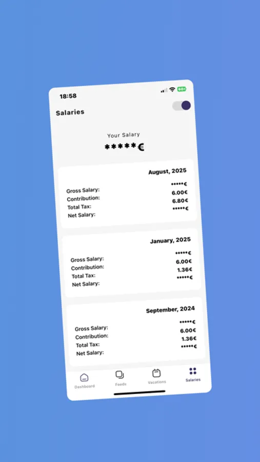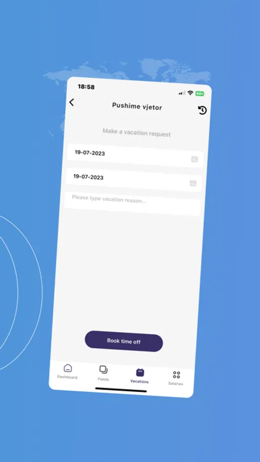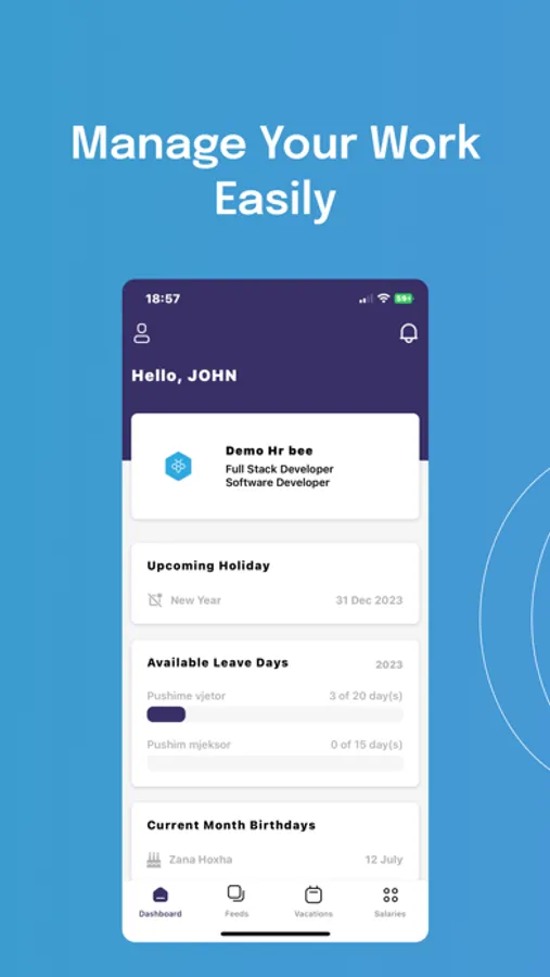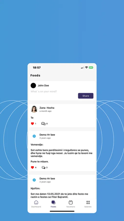 Qasje e stafit ne modulet: Feeds, Profile, Vacation, Salary, Work Schedule and Performance.