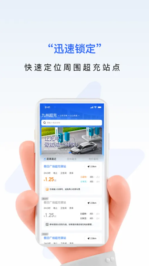 找快充桩就用九州超充,九州超充是九州和为(北京)科技发展有限公司研发的一款快速寻找周围快充超充场站的APP,场站设施,收费情况一览无余,能帮助新能源汽车车主迅速锁定合适的快充场站进行快速充电。
