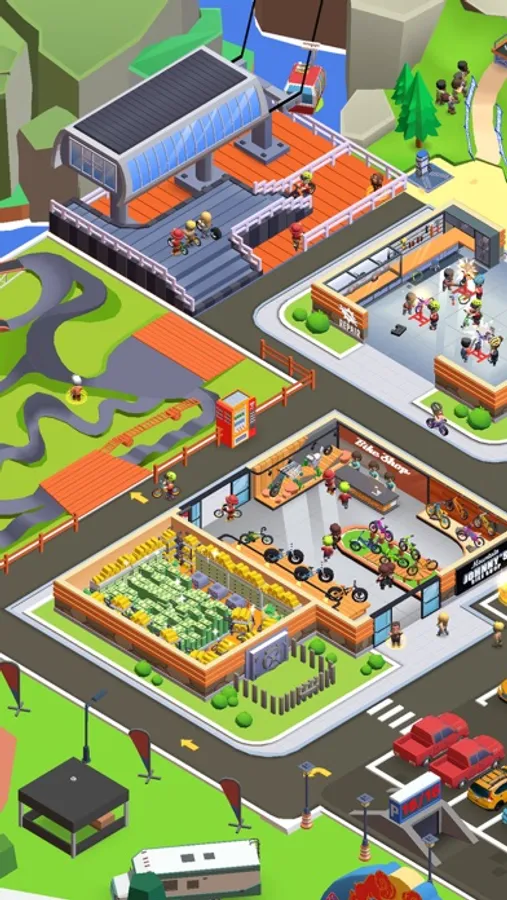 Riders can choose different trails according to their mountain bike level and They can experience different mountain bike modes such as downhill, enduro, freeride. Living facilities are also essential, such as shower rooms, repair shops drink shops and restaurants. Riders can train various tricks in the bike school, fix the broken bicycles in the repair shop, and buy all kinds of accessories in the accessory shop. And you can add amusement facilities such as wingsuit flying, motocross training and western bar. As you level up, you can unlock new locations and amenities to attract more visitors. By managing these resources carefully, you can create a beautiful and thriving mountain bike park that riders will love.