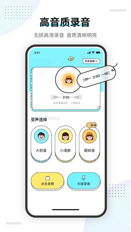 它能录制高音质音视频,进行AI降噪,音质清晰明亮;可多种语音变声录制视频音频,大叔音、小清新、萌妹音,更多趣味变声等你选择;历史音视频还可保存录制的音视频,便于快速查看分享。