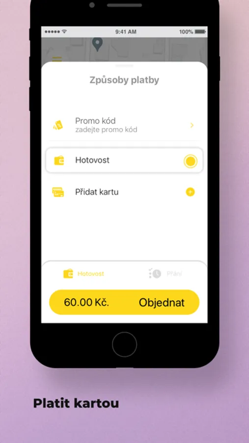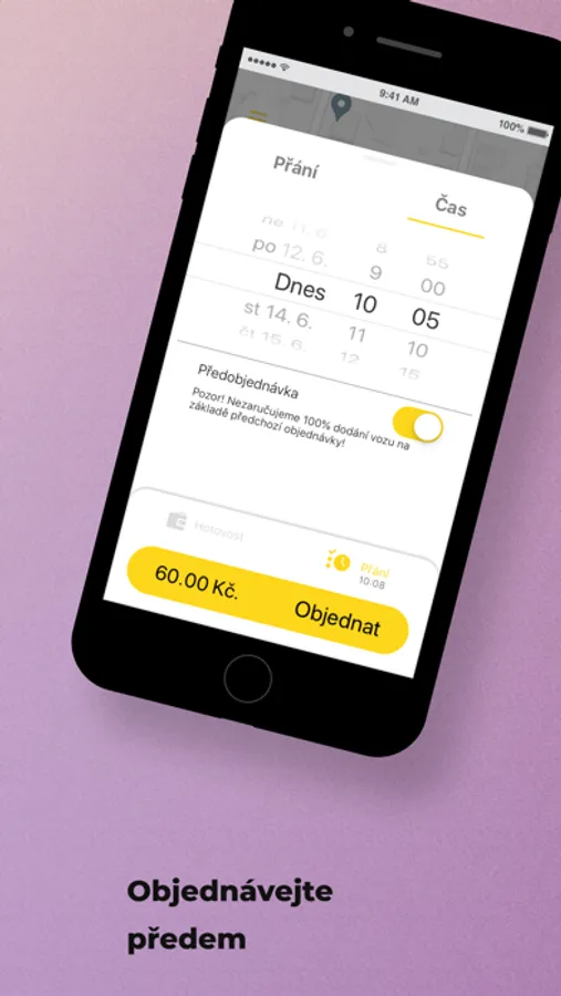 Vyberte možnost „Předobjednat“. Objednavka se do vozu odešle krátce před vámi stanoveným časem a vůz dorazí v čas. Také budete předem znát náklady na cestu.