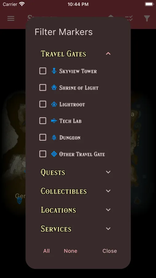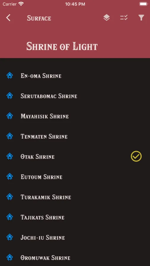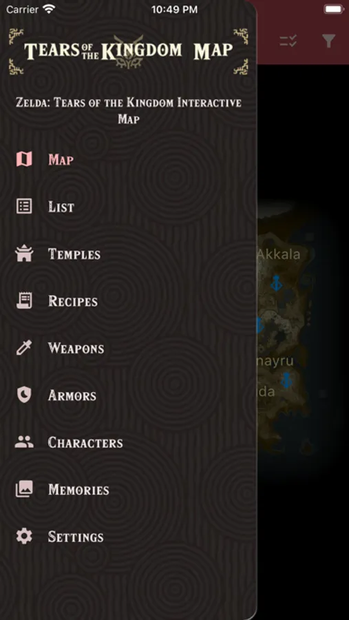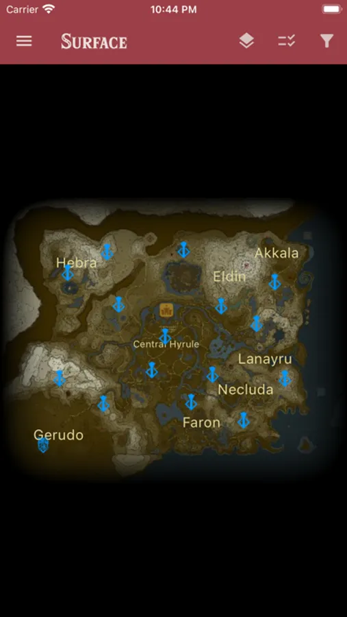 The map contains lots of data as shown in the screenshots, including Skyview Tower, Shrine of Light, Quest, Korok Seed, Bosses and many other collections.