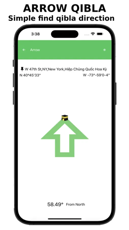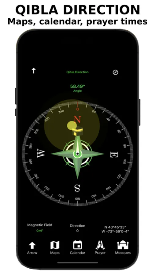- Arrow Qibla Direction: simple to find the qibla on screen with only an arrow and angle.