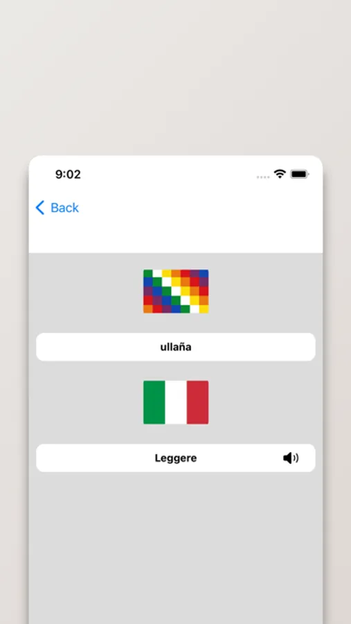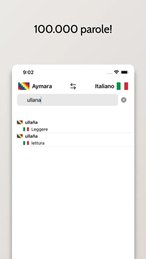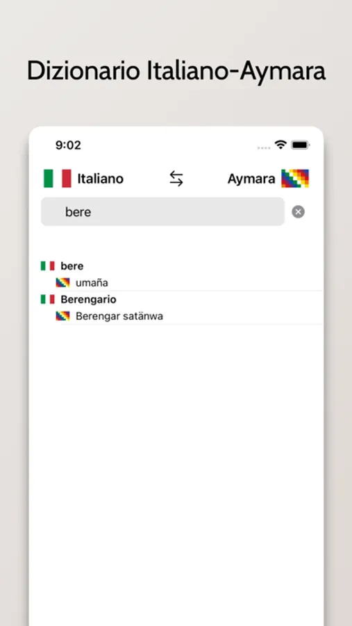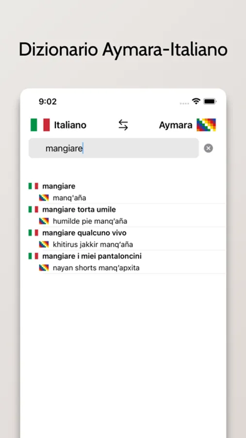 - Possibilità di cercare a partire da parole in Italiano o Aymara
