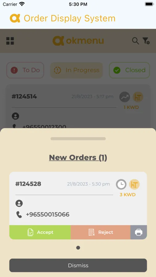 Welcome to the Order Display System, your ultimate solution for seamless order management. Our app is designed to empower businesses with streamlined tools for accepting, rejecting, and managing orders effortlessly, all in real-time.