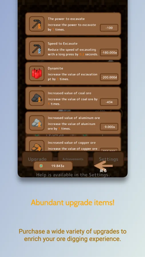 Use the ore you obtain to purchase various upgrades. Get tools that can increase the mining speed and increase the value of ore efficiently. Create a strategy to acquire more ore!