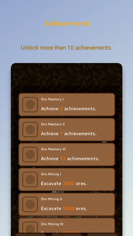 The objective of the game is to unearth ores from underground veins. Tap to mine ores and get more and more abundant ores.