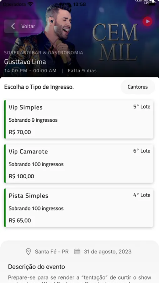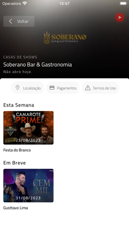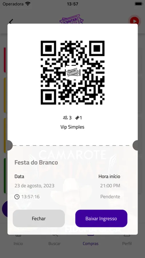 Os eventos estão divididos por região e categorias, como festas, baladas, festivais e muitos outros. Ao escolher seu evento o seu ingressos ficará armazenado em compras para efetuar o pagamento, e após pagar será gerado seu QR code para entrar no evento.
