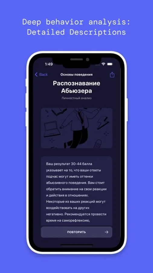 Behavio is your guide to the world of psychological self-discovery. Take tests that will reveal your inner motives and behavior patterns. Deal with childhood traumas, assess the degree of abuse - all in one application. Deep analysis will help you understand yourself and learn to interact better with others. Take on the challenge of self-discovery with Behavio!