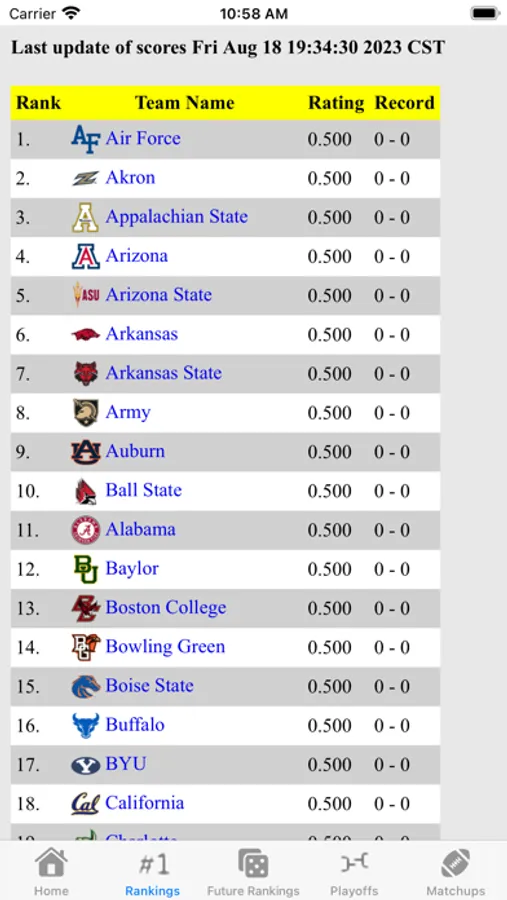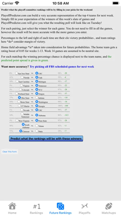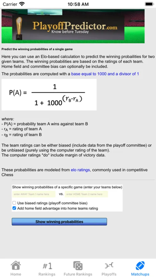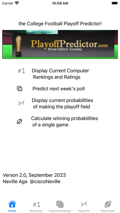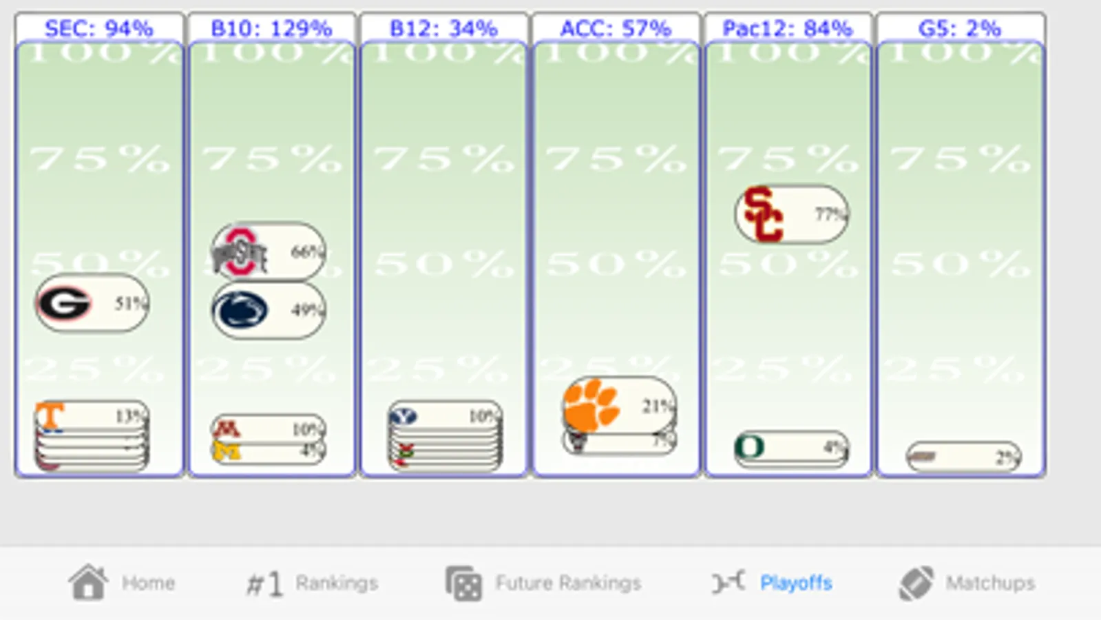 The official app of PlayoffPredictor.com, predicting what teams the playoff committee will select as soon as games go final on Saturdays. You can also see computer ratings and rankings per team, explore head-to-head matchups, and input game winners to see what future rankings will be.