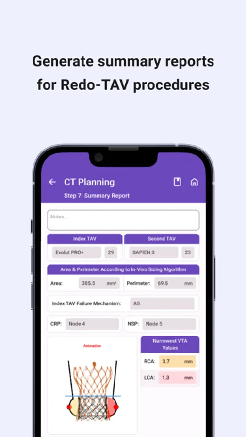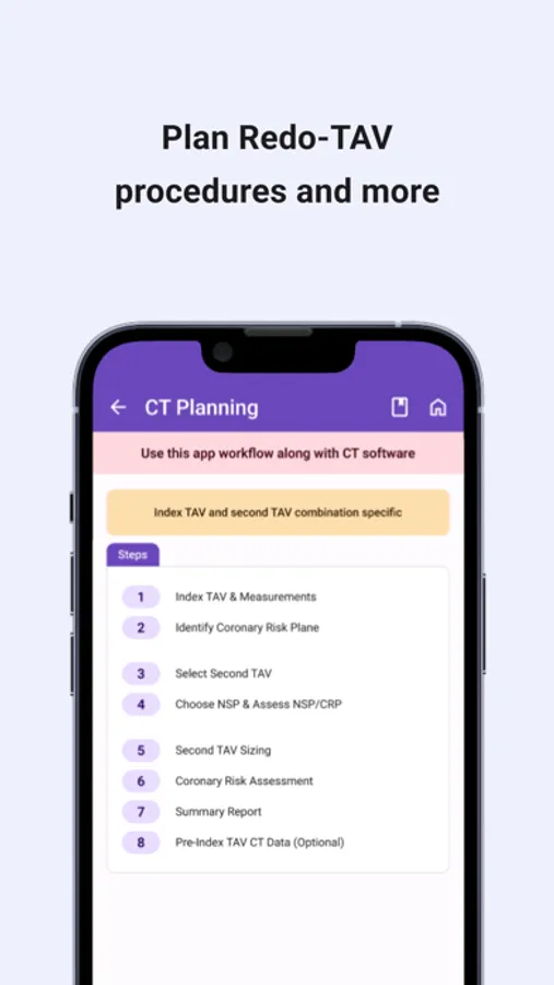 The Redo TAV app provides guidelines for assessing the suitability of a transcatheter aortic valve for Redo-TAV procedures using systematic CT analysis (Redo-TAV CT planning) and provides procedural guidance (Procedural Guide) for the procedure. The algorithm behind the app has been derived from extensive research of published materials on Redo-TAV procedures, including bench and CT simulation work.