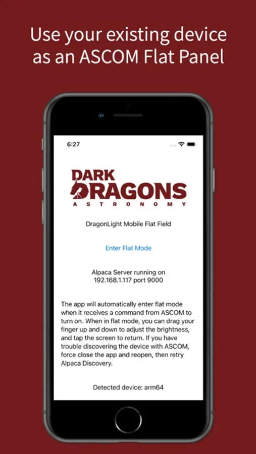 The DragonLight Mobile app turns your iPad or iPhone into an ASCOM compatible Flat Panel for taking calibration images. Because it works with ASCOM, you can control the app with your favorite astronomy sequencing software, including N.I.N.A. and Sequence Generator Pro. Save money by using the device you already own instead of purchasing a dedicated flat panel.