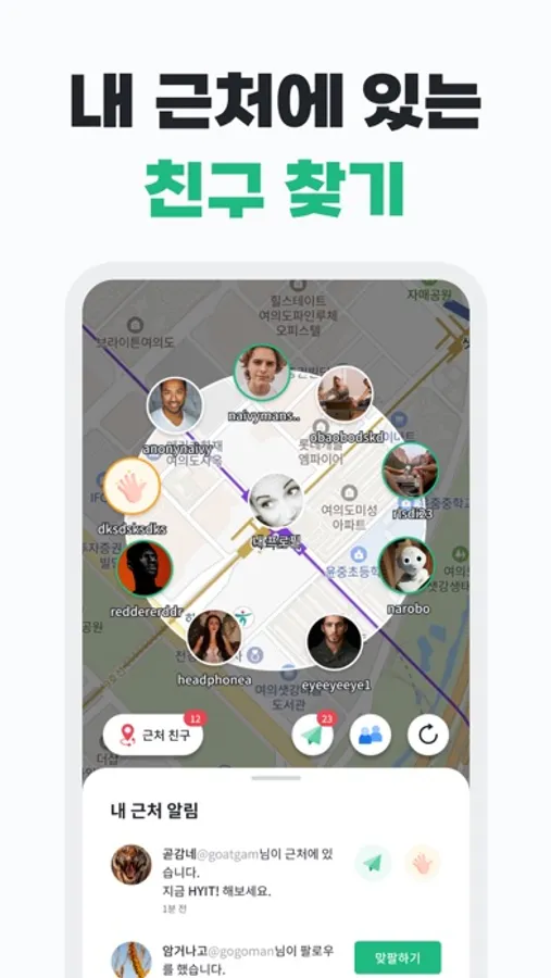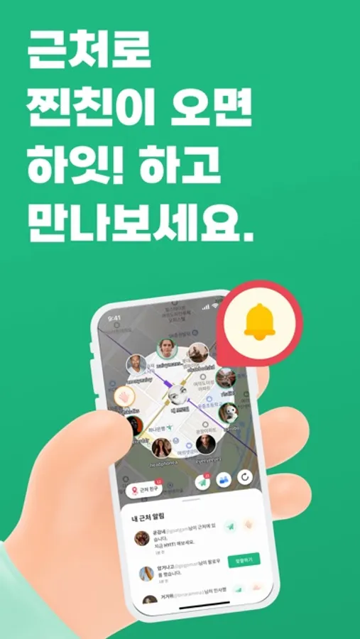 지금 내 친구를 등록하고, 근처로 찐친이 오면 하잇! 하고 만나보세요.