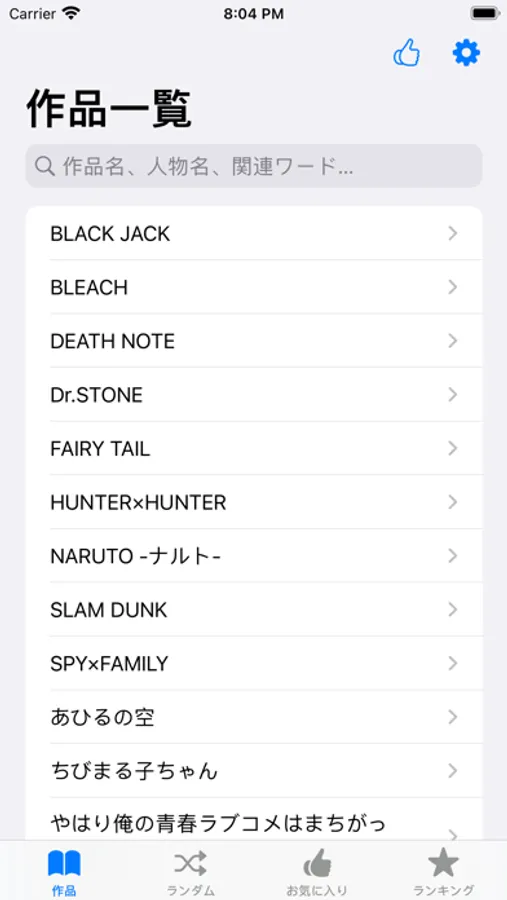 作品のタイトル、人物、名言を一覧で見ることができます。
