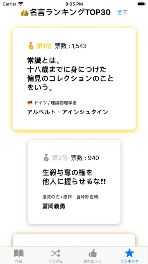 本アプリを利用していただいている全てのユーザーが選ぶ「名言ランキングTOP30」を見ることができます。
