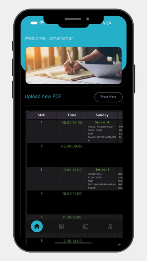 نظام اختيار الدورات: التطبيق مجهز بإمكانية قراءة ملفات PDF وتحويلها إلى جداول مُنظَّمة، مع خيار للطلبة لتعيين وقت البداية، أوقات الدورات، والفترات الزمنية للإجازات والاستراحة، حسب تفضيلاتهم. يُمكن لهذا النظام أن يُمنح الطلبة مرونة أكبر في ترتيب الجداول المختلفة بما يتلاءم مع احتياجاتهم الفردية.
