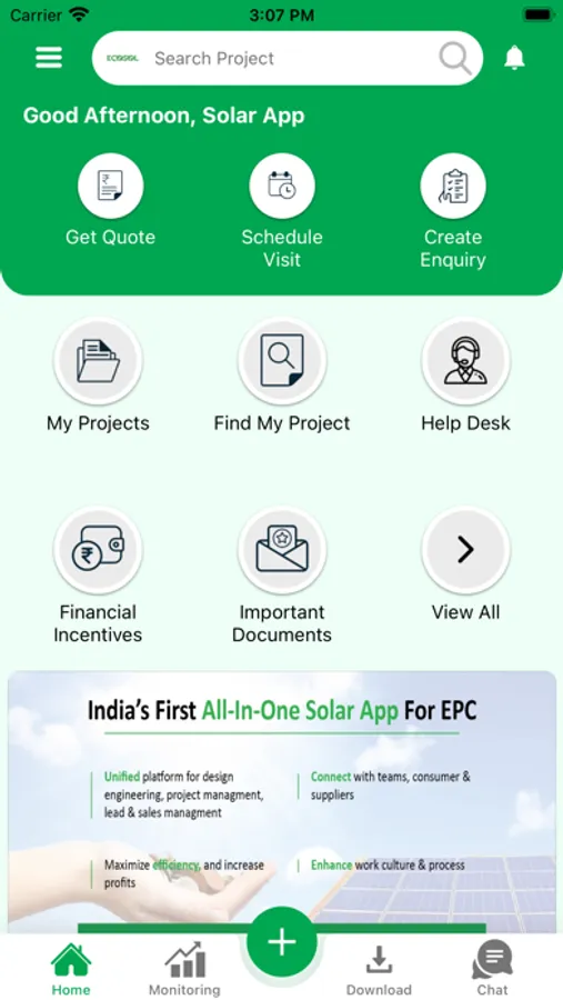 ECOSOL is a Solar PV app. ECOSOL helps you to work and manage your technical and sales requirement wherever you are. ECOSOL is a marketplace and a common platform that connects Consumers, PV Installers, DisComs and State Nodal Agencies. ECOSOL app allows user to: