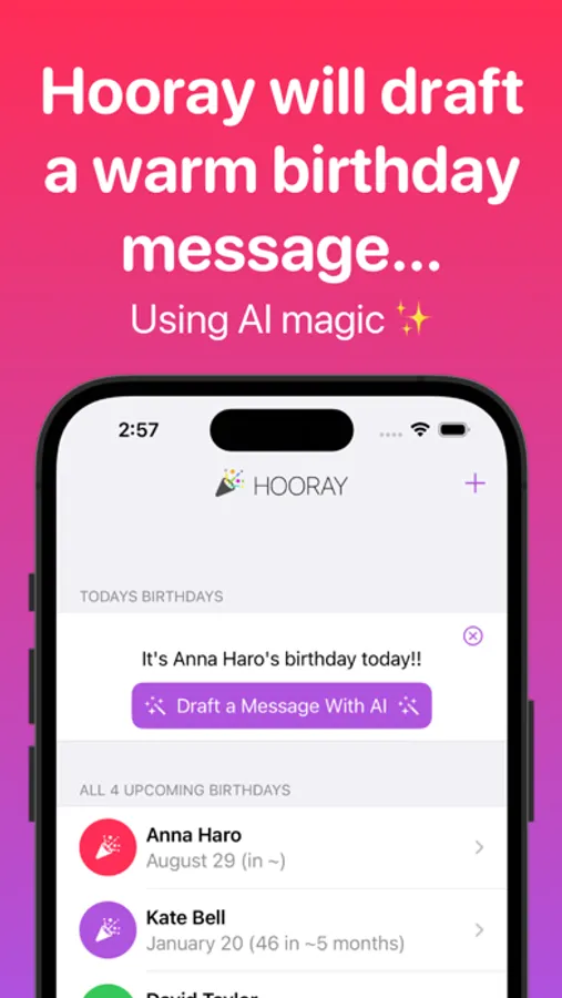 Hooray sends reminds you about birthdays on time, EVERY year and can also help you draft a personalized birthday message. Your draft messages are personalized for both the sender and the recipient and you can edit each message before sending, to ensure it is just right.