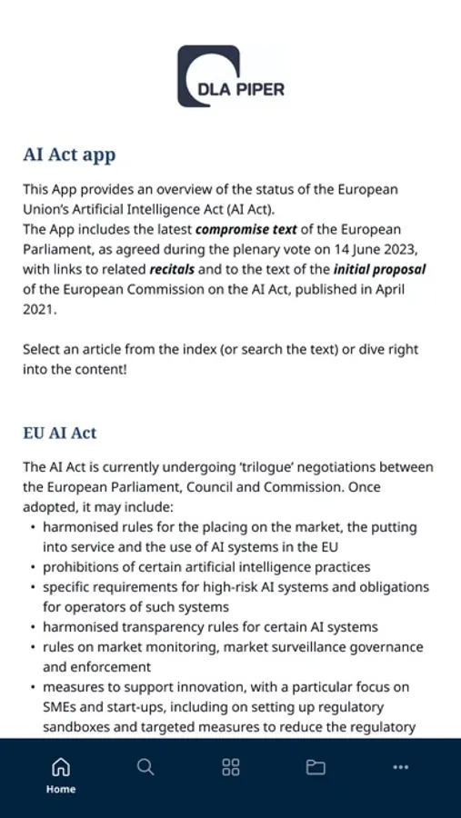 DLA Piper’s EU AI Act app allows users to consult the latest version of the EU AI Act on their mobile phone or tablet.