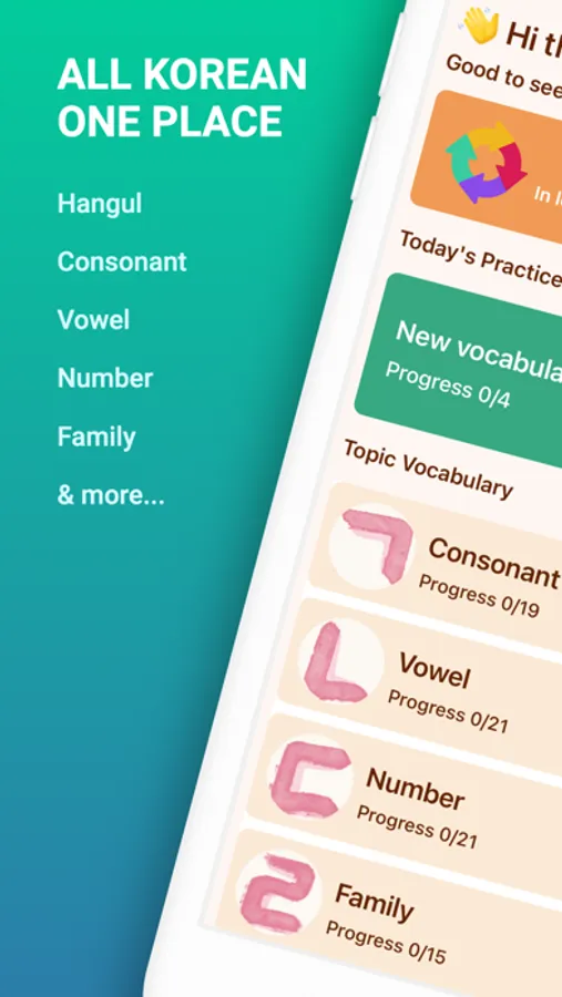 Vocabulary only: Zero grammar, just handpicked practical words. That’s our focus and we do it extremely well. The app teaches the Korean “alphabet” Hangul (hangoul) too!