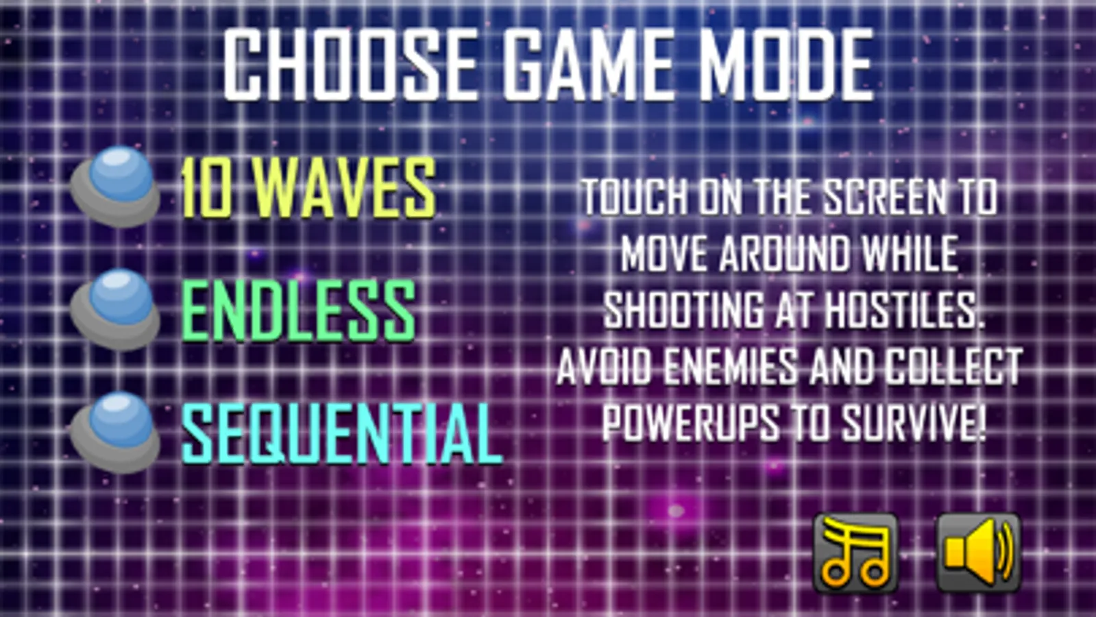 Touch on the screen to move around while shooting at hostiles. avoid enemies and collect powerups to survive!
