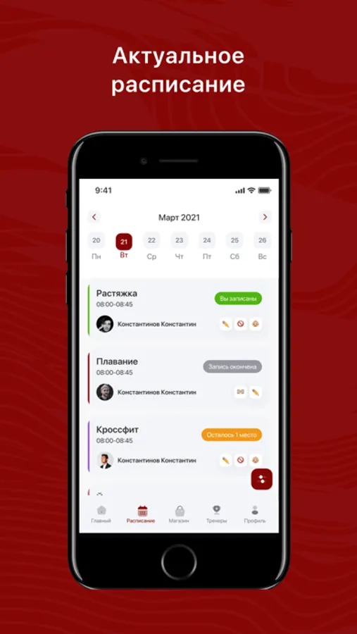 - Посмотреть актуальное расписание тренировок;