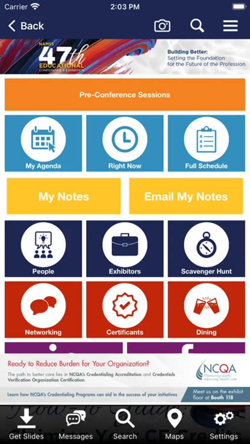 The NAMSS mobile application allows you to view the schedule, presentations, exhibitors and speaker details from the conference. Users can take notes adjacent available presentation slides and draw directly on slides inside the app. Note-taking is also available in the posters and exhibitors modules.