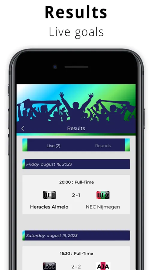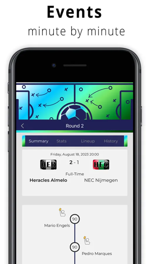 - Follow the matches in LIVE mode. All the events of the match: result, goals, cards, etc.