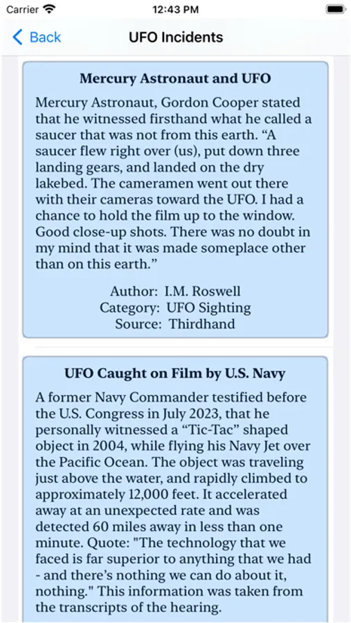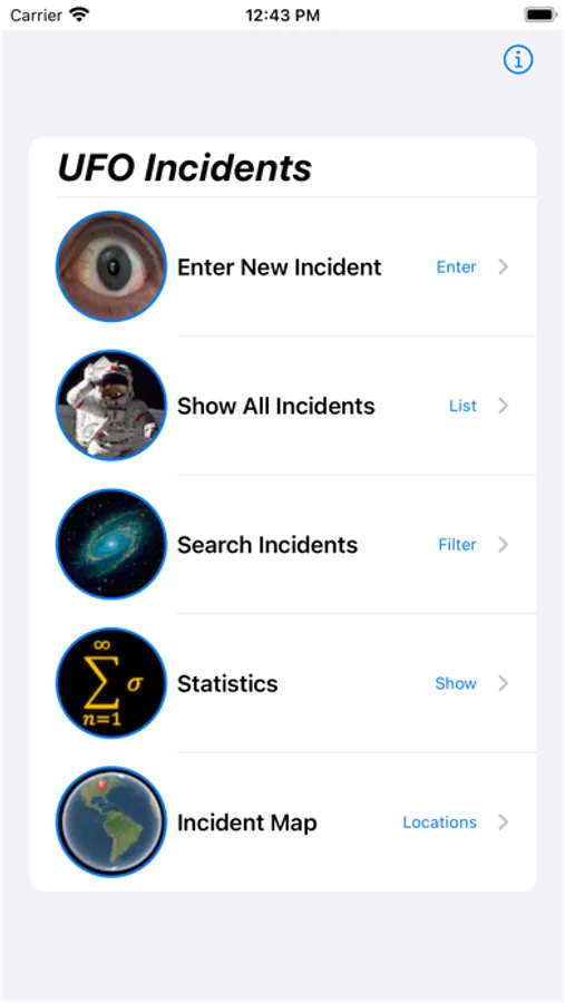 The UFO Incidents App is a living archive of extraterrestrial experiences and observations. Anyone with an experience to share is encouraged to enter a description of the incident into the app. A dedicated database has been set up in iCloud and is used to store all of the information - the data is then sorted into categories and shown on a global map. Users can read all of the experiences that have been entered and see where in the world the incident occurred. The UFO Incidents App is completely private - no user information is collected for sale or any other purpose. Enjoy the app and please do not hesitate to provide feedback on making improvements.