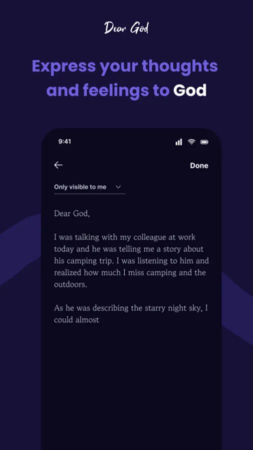 Use this app on your spiritual journey with God to document diverse moments in your life. Don't worry, it doesn't need to be perfect.