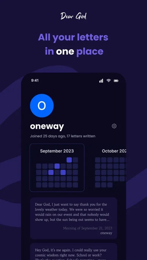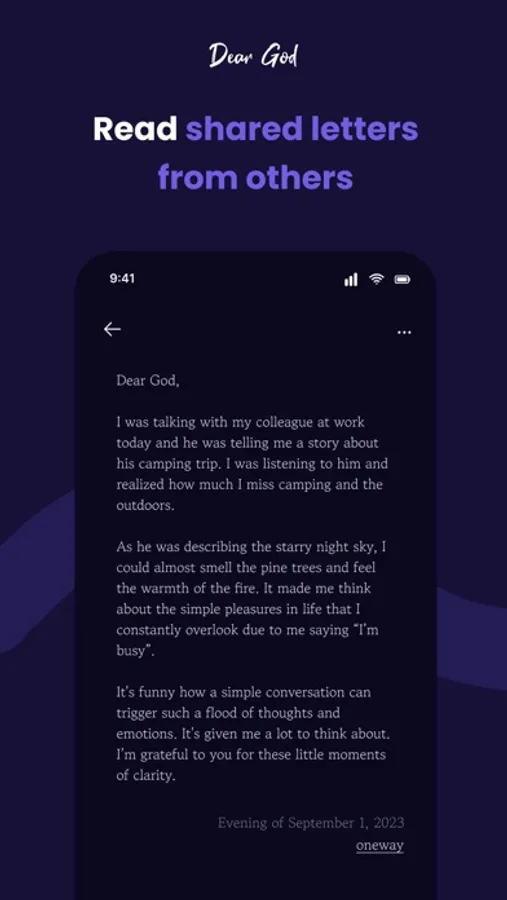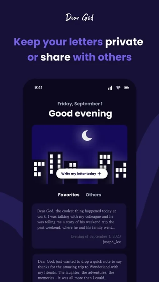 This is a place where you can openly write down your thoughts and feelings to God. On each letter, you can choose to keep it private or share with others.