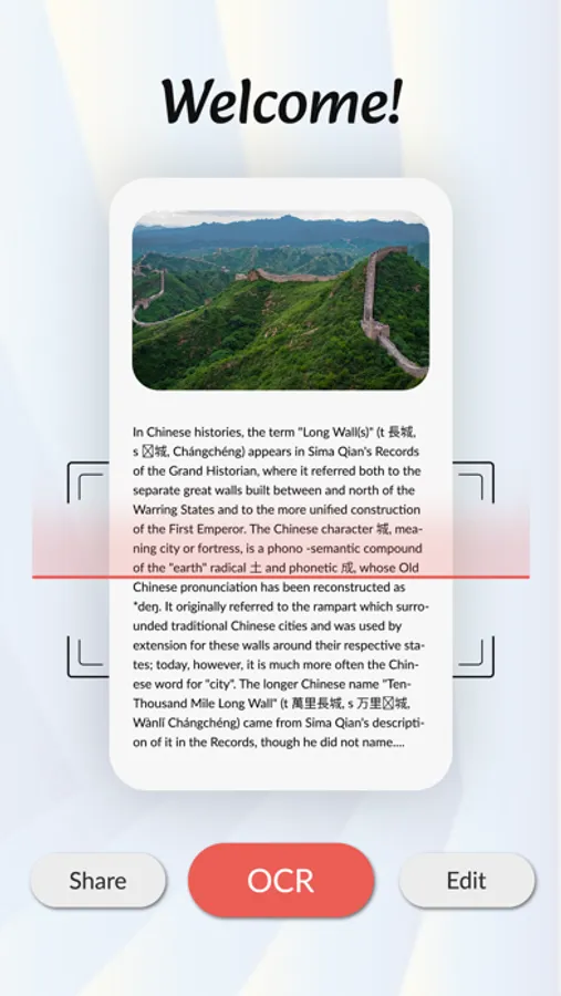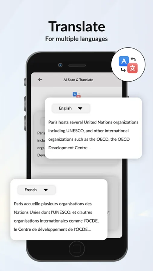 Just take a photo and our powerful AI service detects text automatically. The camera can scan text and large documents in various languages and translate them into other languages.
