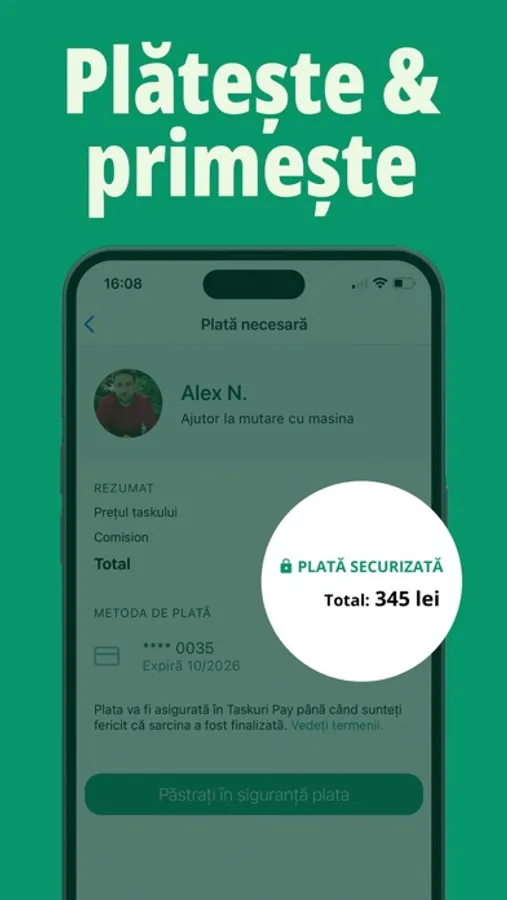Plata pentru sarcină se rezolvă atunci când se acceptă o ofertă și este ținută în siguranță până când sarcina este finalizată. Astfel, atât Posteri cât și Taskeri pot fi încrezători că plata este pregătită și sarcina poate fi realizată fără ezitare.