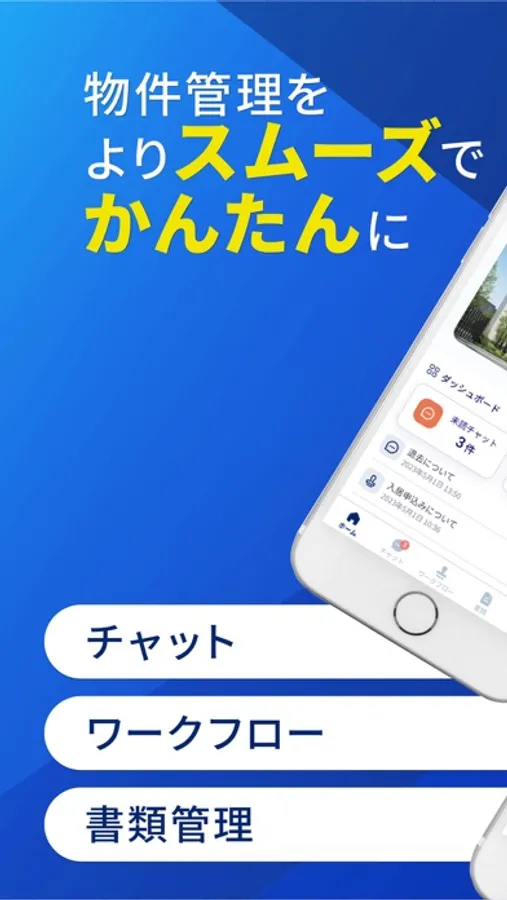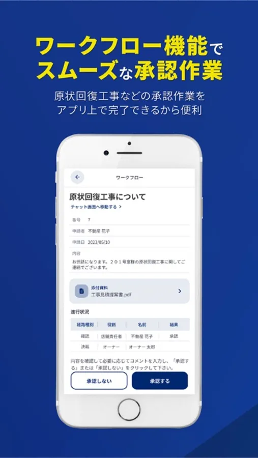 「修繕見積書」「募集条件」などの確認依頼をメッセージで受け取り、承認・否決の返答や進捗状況の確認ができます。また、書類の確認や承認作業をどこにいても、あっという間に完了できます。