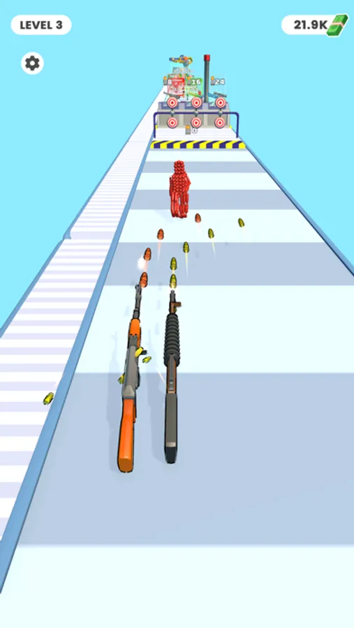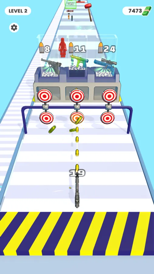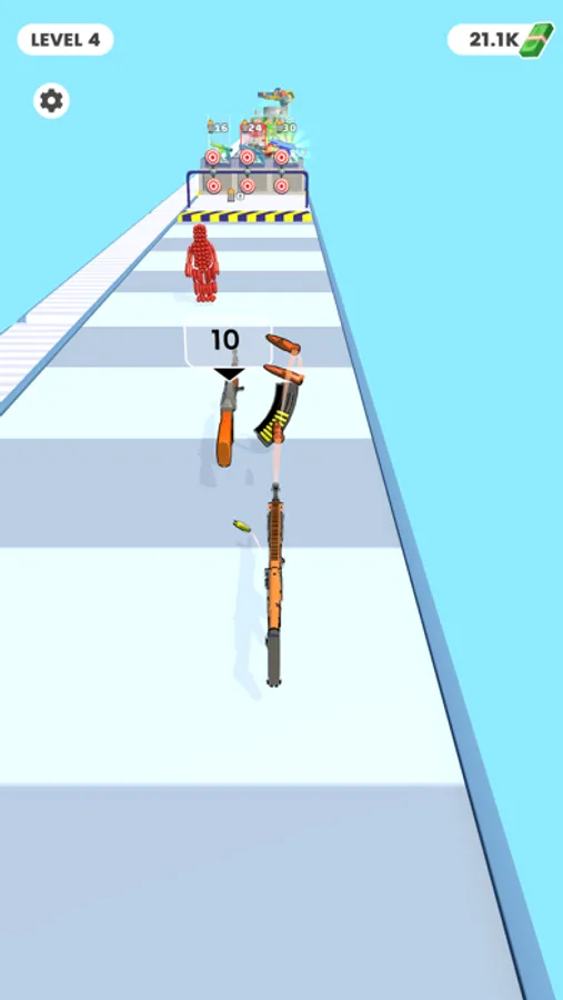 Shoot stickmen made of bullets to destroy them. Evolve by crafting additional weapons during the mini game to continue advancing.