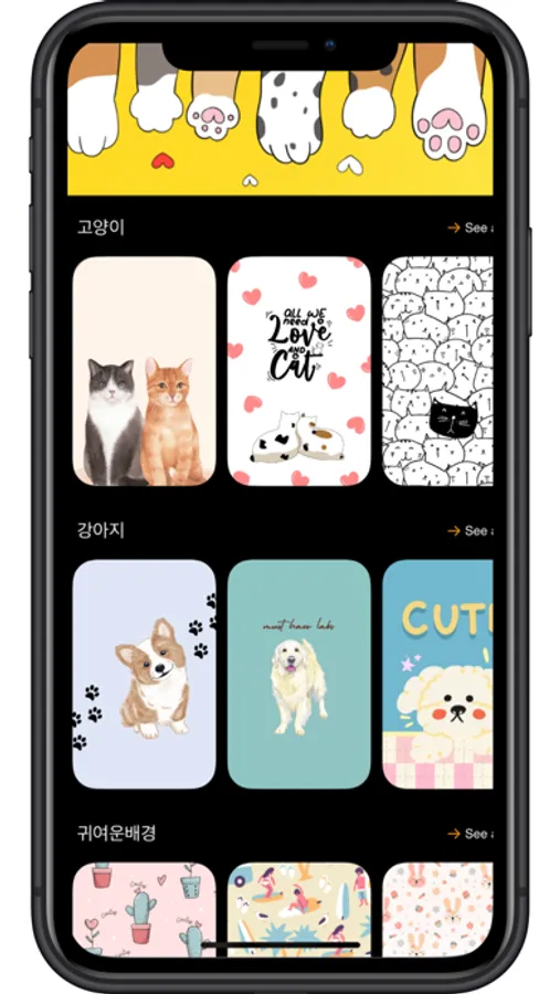 고양이, 강아지, 실사고양이&강아지, 귀여운배경화면 4가지 카테고리로 구성되어 편하게 찾아서 원하는 이미지만 다운받아서 배경화면으로 사용하실 수 있습니다.