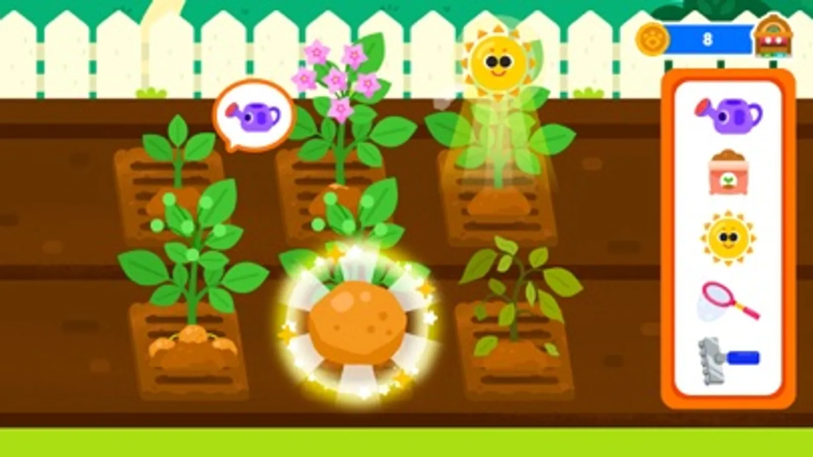 -Field: Plant potatoes, wheat, lettuce, and tomatoes. Help them grow quickly