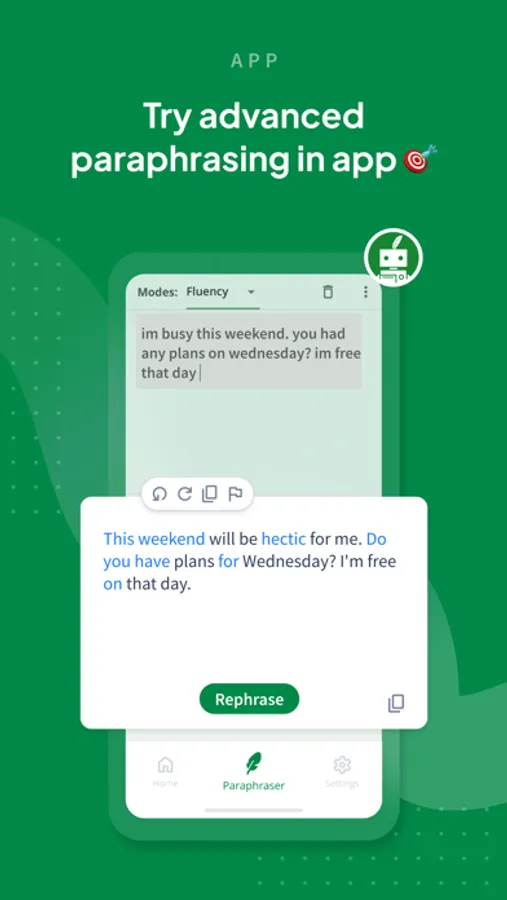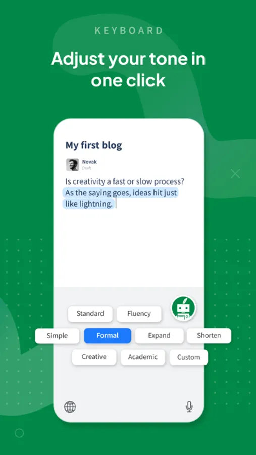 Our AI Writing Keyboard gives you instant access to Grammar Checker, Paraphraser, and Translator in any app. Enjoy seamless writing support wherever you type; review, rephrase, and translate your text without switching apps.