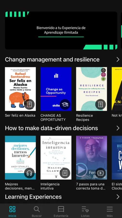 Master and Minds Learning de BNF pone a disposición de sus colaboradores miles de contenidos en diferentes formatos (ebooks, audiobooks, podcasts, vídeos, cursos, revistas, etc.), temáticas e idiomas para que puedas personalizar tu experiencia de aprendizaje, en función de tus gustos y preferencias.