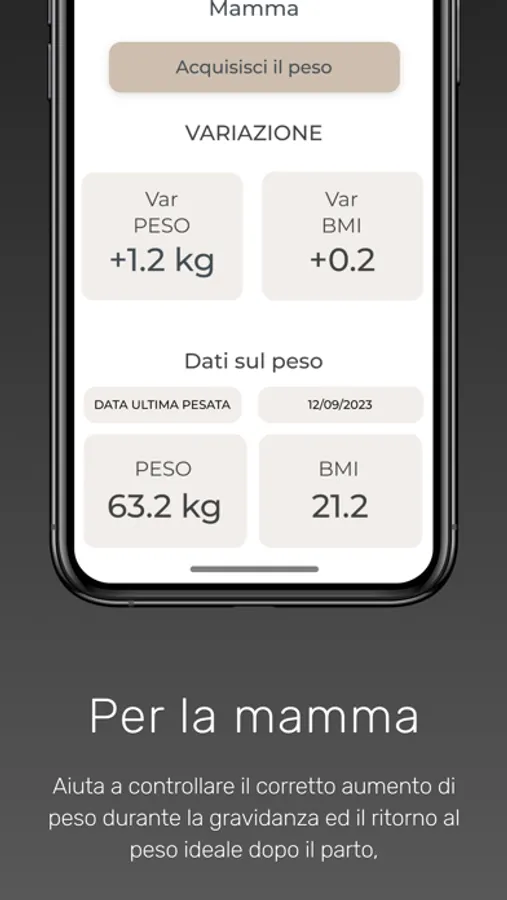 - per la mamma, aiuta a controllare il corretto aumento di peso durante la gravidanza ed il ritorno al peso ideale dopo il parto, così da tenere traccia dell’andamento.