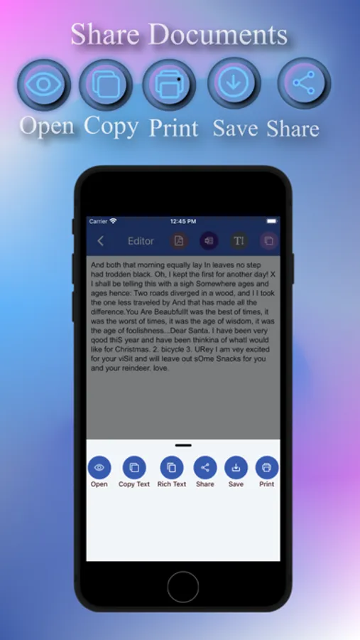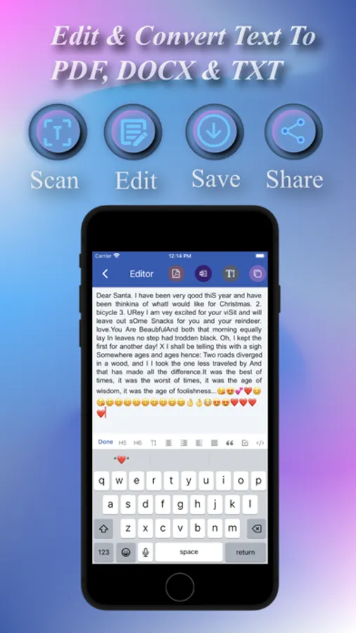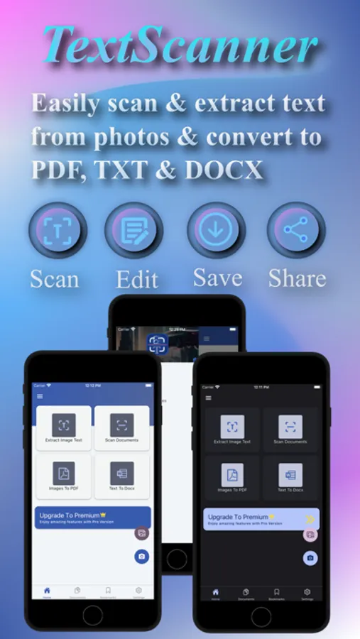 - Capture text from images using your device's camera, and convert it to text, PDF, DOCX, or TXT formats for sharing.