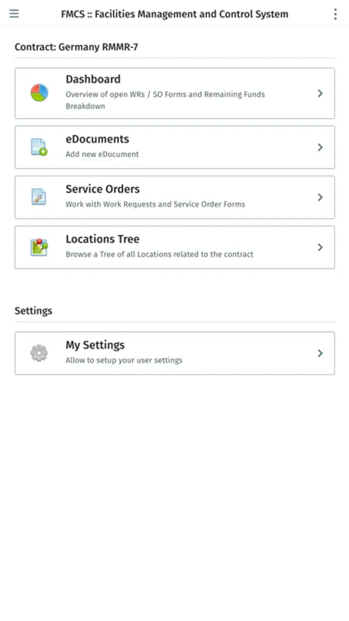 The F.M.C.S. app is a tool to help facilitate facility management and control. Users are able to setup facilities, assets, and process flows, among other features, in order to initiate, track, and review scheduled maintenance, inspections, and unscheduled repairs and modifications to facilities.