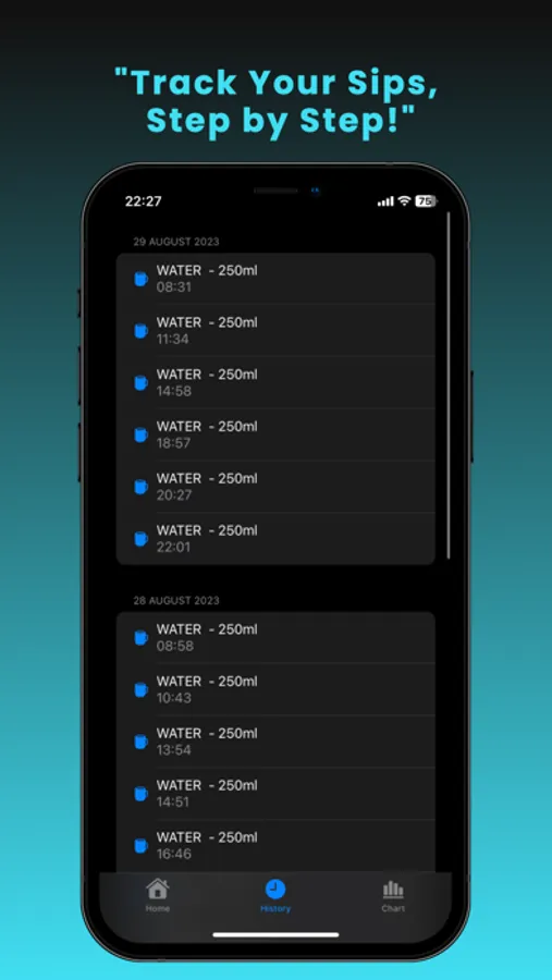 Your Hydration History: Easily look back at your past water consumption. Step back to step forward in your hydration journey!