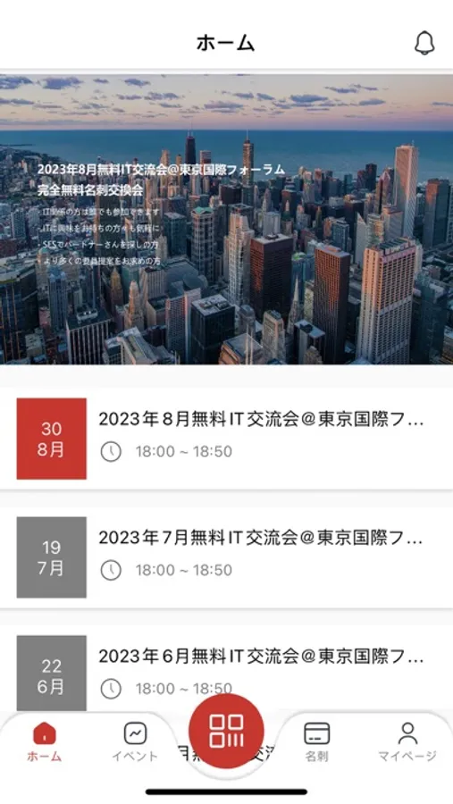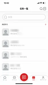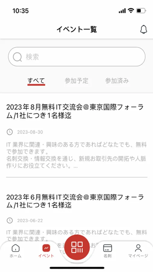 こちらのアプリは、会員登録。イベントの紹介・更新、内容開示、通知一覧、エントリー操作、名刺情報のスキャン・アップロード、QRコードの提示機能が搭載されています。