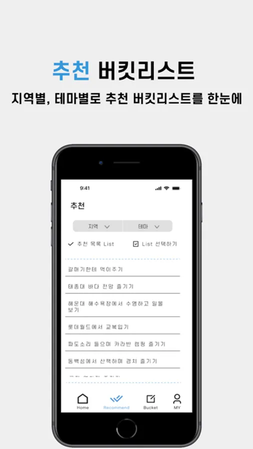- 지역, 여행 테마 카테고리만 선택하면, 카테고리에 맞는 버킷리스트 항목들을 추천해드립니다.